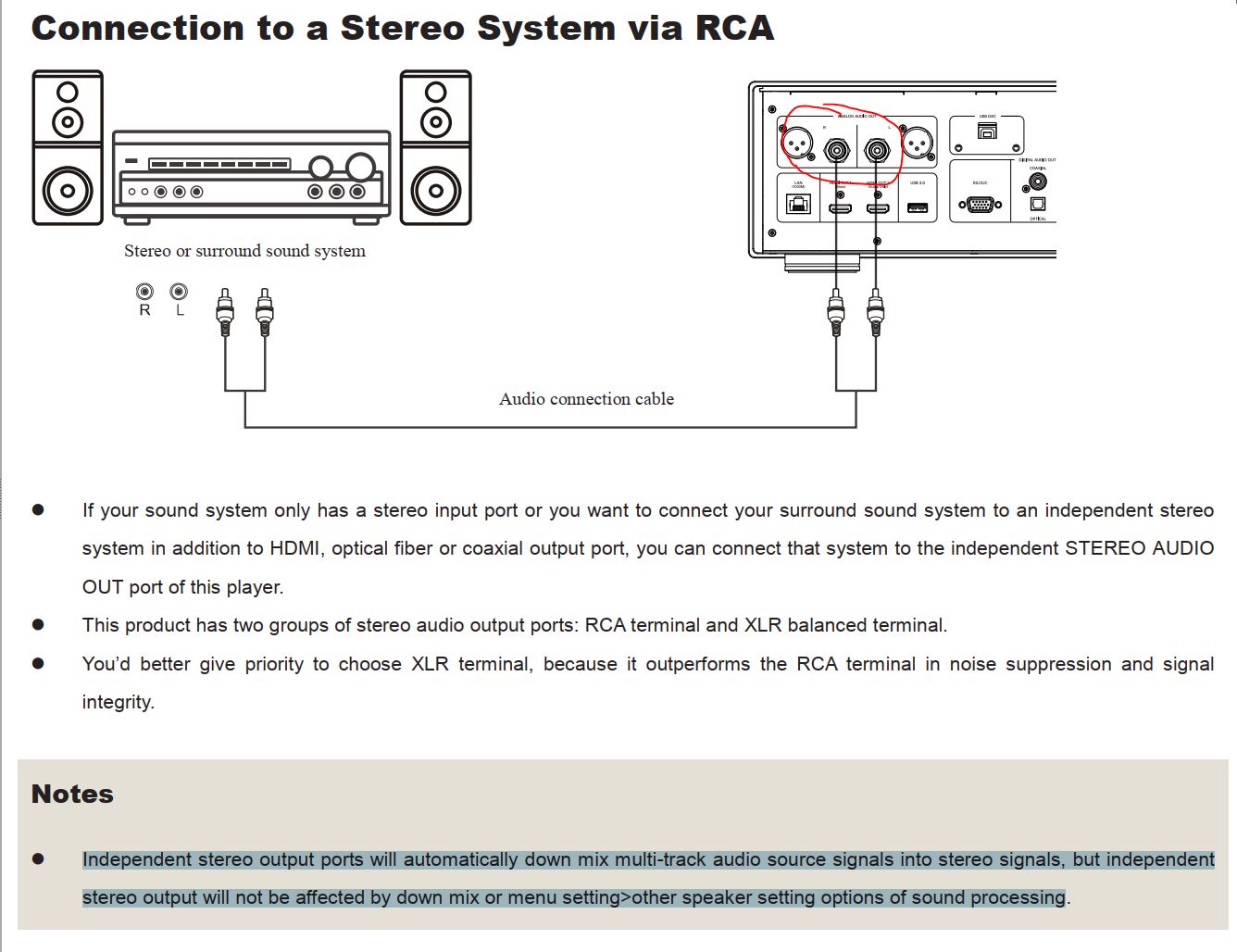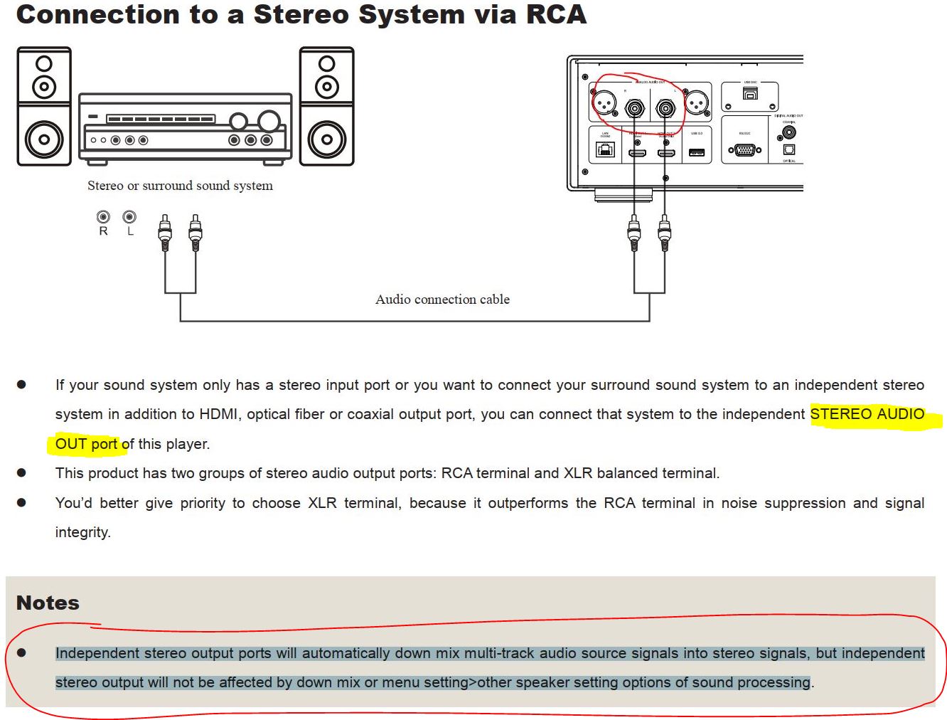 Independent stereo output ports will automatically down mix multi-track audio source signals into stereo signals, but independent stereo output will not be affected by down mix or menu setting>other speaker setting options of sound processing.
