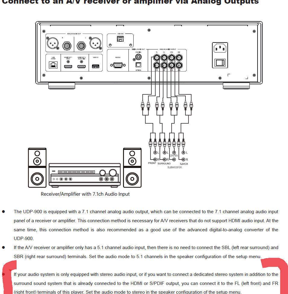 - SL/SR analog outputs are fed to a 2nd amp to drive the rears